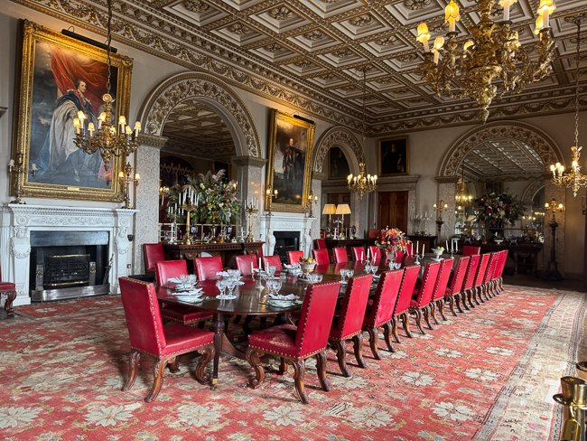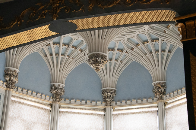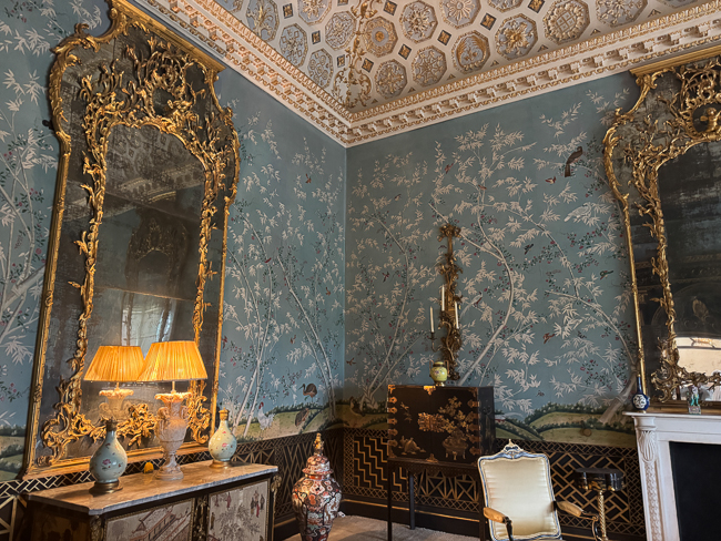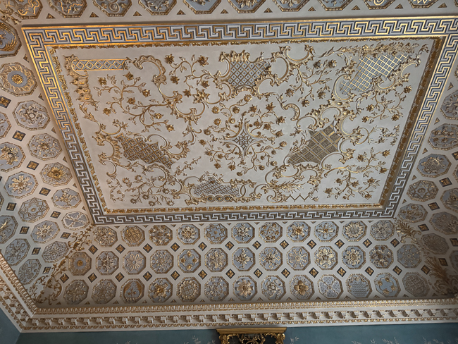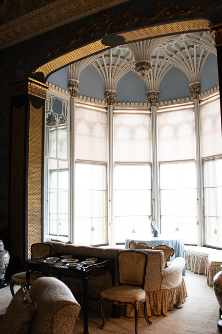 The house is set such that it has very ornate rooms for entertaining and then long, long halls filled with portraits of the family over the years. The room that caught my eye was the Chinese drawing room, which has a gorgeous plaster ceiling and an 18th-century fan-vaulted oriel window.