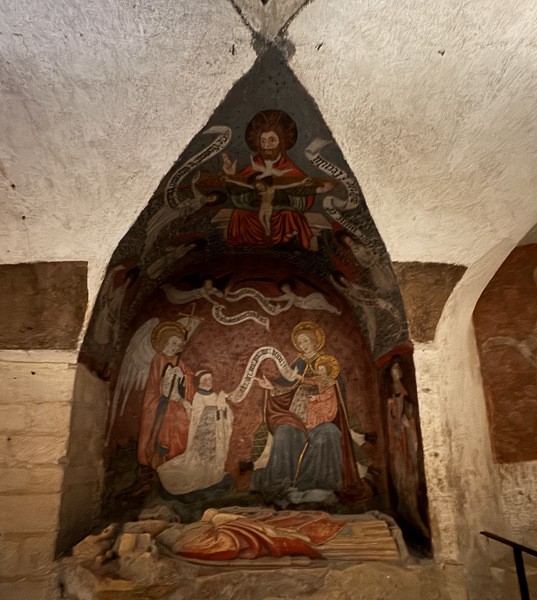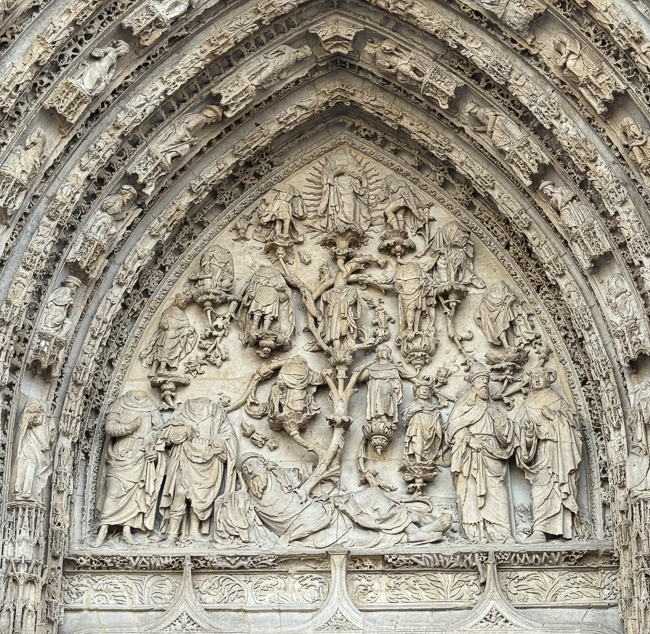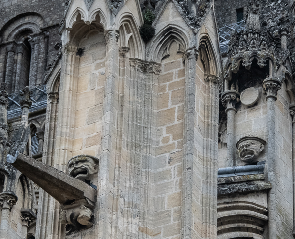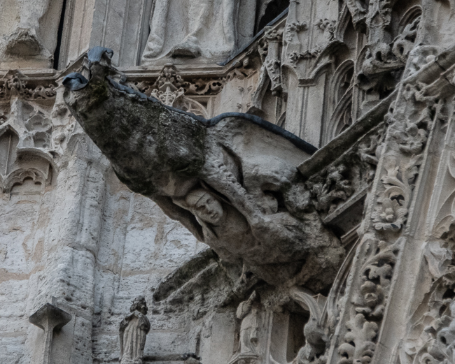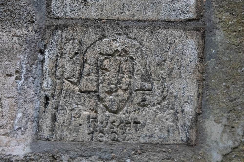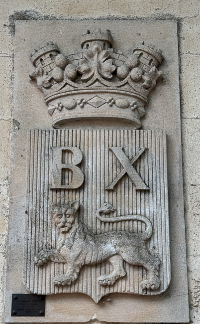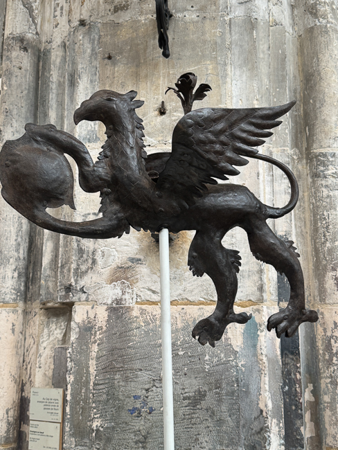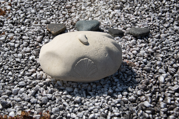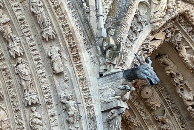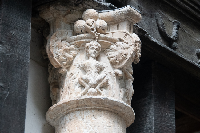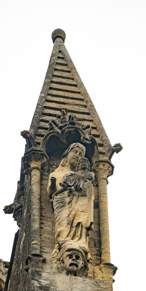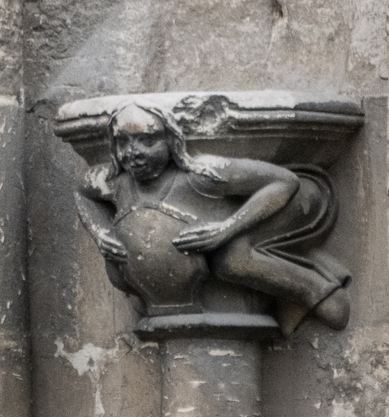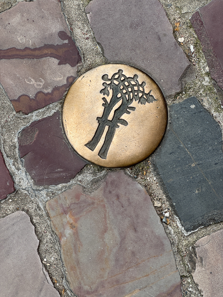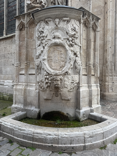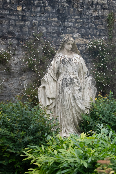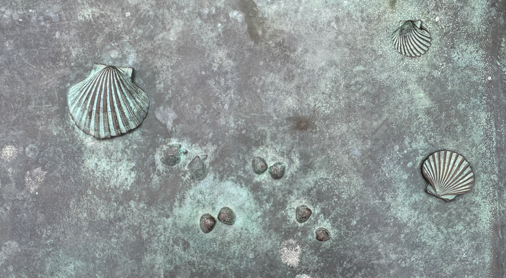 The cast concrete sundial shows a face in a scallop shell. The scallop shell refers to the “Way of St. James”. Pilgrims passed through rue Saint-Jacques, Paris’s oldest street, which was named for the pilgrimage made to the Santiago de Compostela or Saint-Jacques de Compostelle in French.