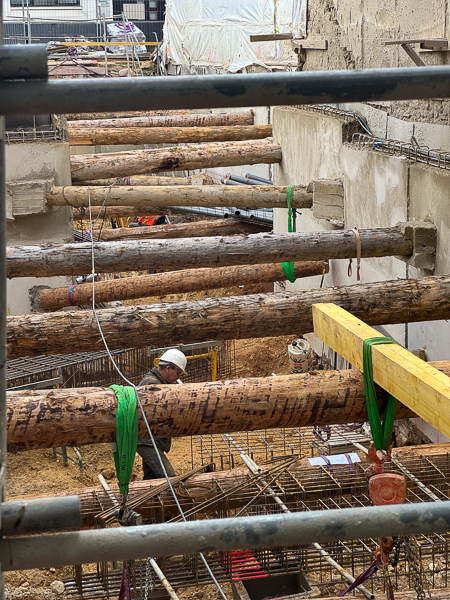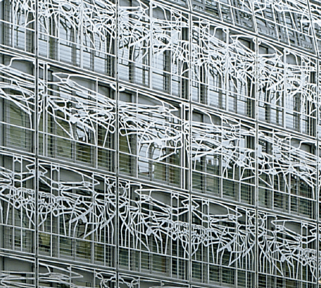 This building underwent a major renovation from 2002 to 2004.  The latticework is made up of 12 mm-thick stainless steel panels wrapping around all the facades facing the street. The model drawing for the design of the latticework is based on the frescoes of Giulio Romano at the Te Palace in Mantua, from which six motifs were selected and created by a computer program. Each one of the motifs covers one level, extending over stone, glass, and aluminum.  The latticework is formed by 450 laser-cut panels made of an alloy rich in nickel, which resists pollution.