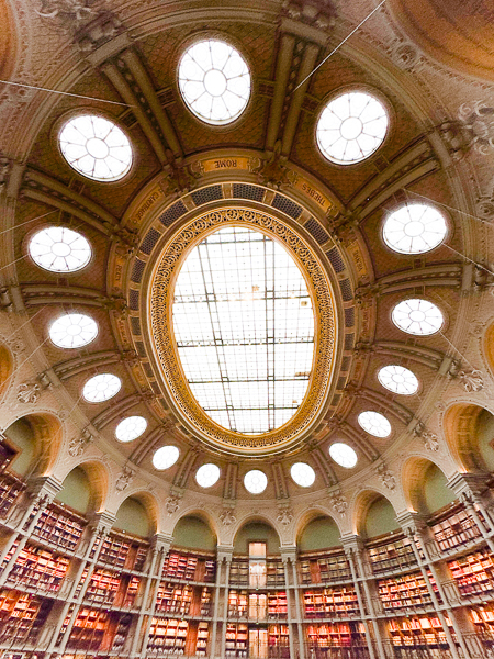 The reading room is jaw-dropping in its beauty.  Designed by Pierre-François-Henri Labrouste, it is a stunning domed room with sixteen iron pillars. The light filters from a series of skylights, and the five-story room seems much larger because of it.