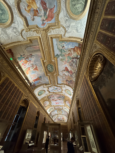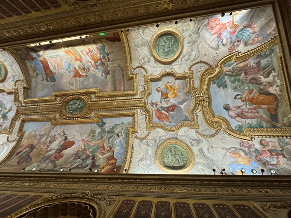 The ceiling was frescoed in 1646-1647 in the Baroque style by Giovanni Francesco Romanelli and Paolo Gismondi. The ceiling’s iconography was inspired by Greco-Roman mythology, particularly Ovid’s Metamorphoses. The center of the ceiling features Jupiter striking down the Giants. The other iconography is Apollo and Daphne, the Judgment of Paris, the Abduction of Helen, and the Fall of Troy.