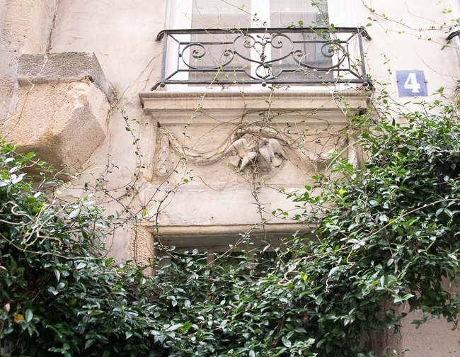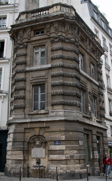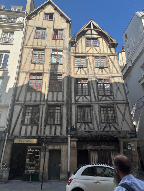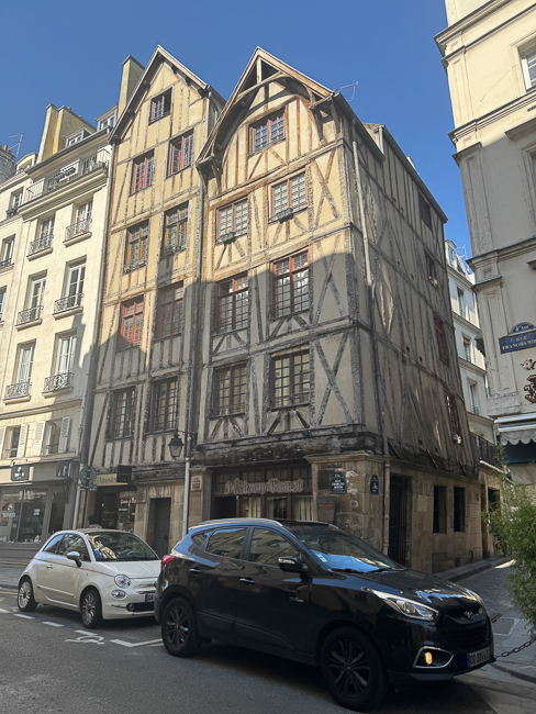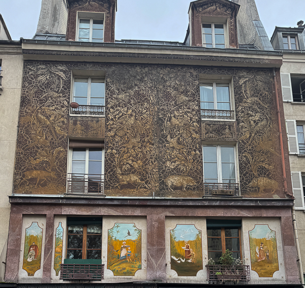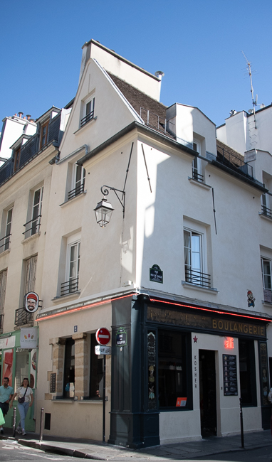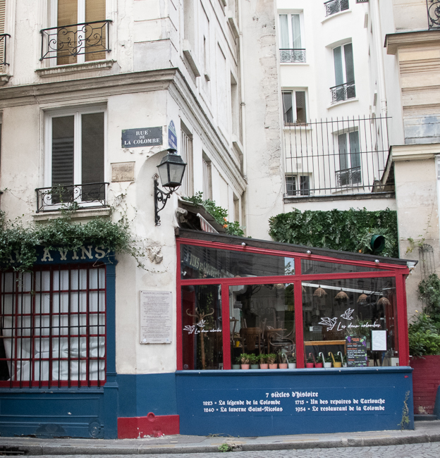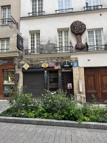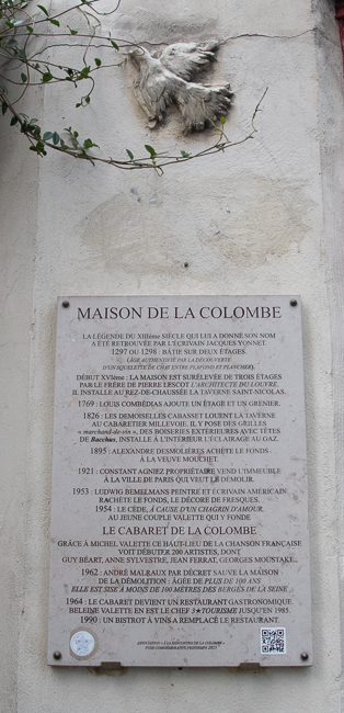 This is number 4 on Rue de la Colombe, or Dove Street. The story goes that around 1225, this place was occupied by a dilapidated one-story house. The first floor was inhabited by a sculptor who used to shelter a couple of tamed doves. When the house collapsed in his absence, the two doves were trapped in the stones.