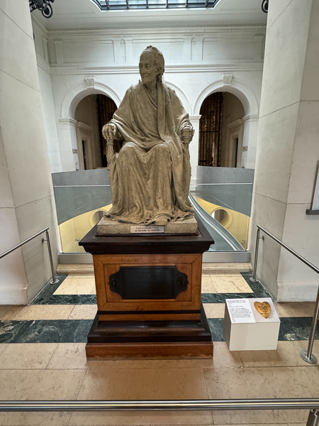 I had very much wanted to see the reading room, but also this statue of Voltaire.  If you look closely, you will see a gold heart on the white box to the right of Voltaire. Voltaire’s heart is said to be in his statue.  According to the New York Times of February 21, 1929: