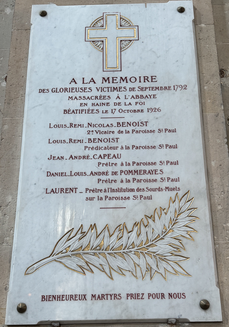 In September of 1792, during the French Revolution, five priests were killed in the church during the September Massacres. The church was closed and turned into a storehouse and a temple of the Cult of Reason and the Supreme Being, before being restored to Catholicism in 1802 under the Concordat of 1801
