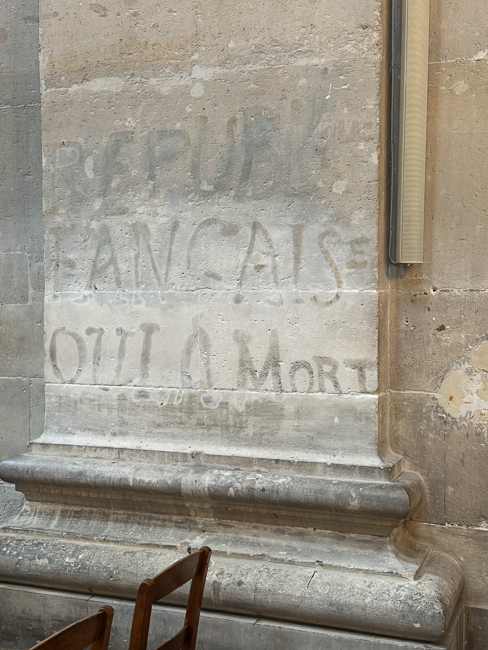 Not much is known about this graffiti on one of the pillars of the church, except that it was written during the Paris Commune, probably the first days of the “bloody week” (May 21-28, 1871). When the Versailles troops entered Paris to put an end to the insurrection of the communards, one of them would have written this message.  It was the attempted cleaning that made this graffiti more visible.