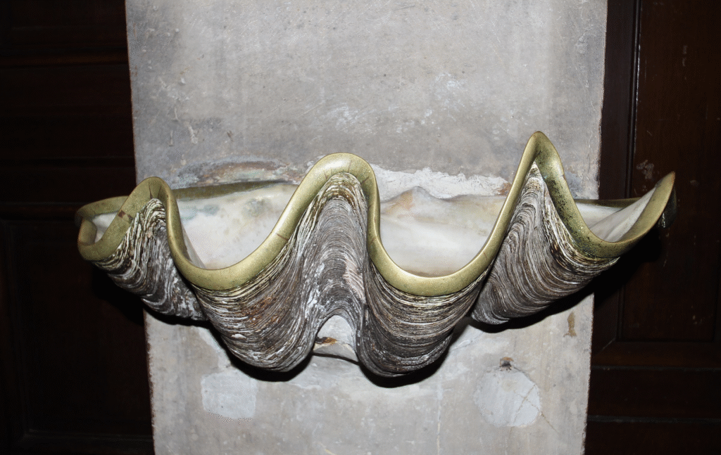 This is one of two shell holy water vessels, donated by Victor Hugo to mark the occasion of the baptism of his first child.