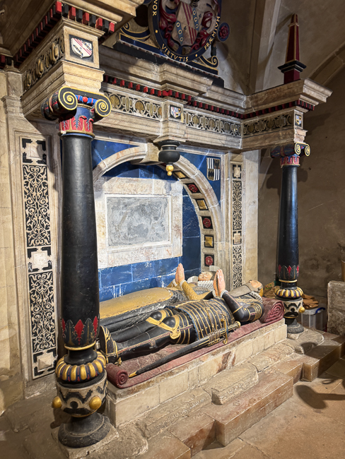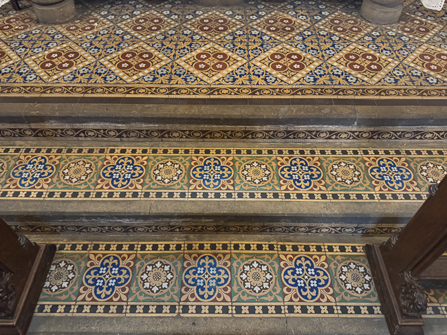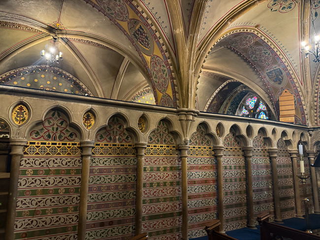 Thomas Wildman, owner of Newstead from 1817 to 1860, restored the chapel in the mid-19th century. In about 1864, William Webb commissioned Charles Buckler to redecorate it. The Gothic revival stencilled wall painting in the style of William Butterfield dates from this period. These designs are said to be taken from illuminated manuscripts of Henry II’s reign and decorations discovered beneath the ceiling plaster.