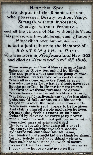The poem “Epitaph to a Dog” by Byron is on the tomb.
