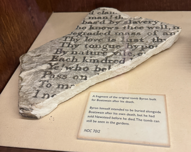 A fragment of the original tomb Byron built for Botswain. Byron himself intended to be buried alongside Boatswain after his own death, but he had sold Newstead before he died.