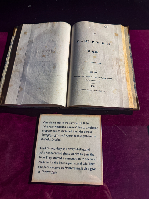One dismal day in the summer of 1816 (the year without a summer due to a volcanic eruption which darkened the skies across Europe), a group of young people gathered at the Villa Diodati. Lord Byron, Mary and Percy Shelley, and John Polidori read ghost stories to pass the time. They started a competition to see who could write the best supernatural tale. That competition gave us Frankenstein and the Vampyre.