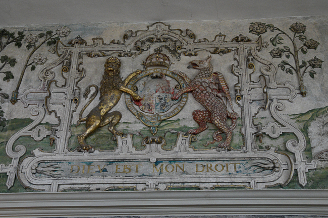 A plaster frieze in the High Chamber is that of Queen Elizabeth I. In 1603, James VI, King of Scots, also became James I, King of England. He amended the Royal Arms in England to include elements from the Scottish Royal Coat of Arms. The Scottish Unicorn replaced the Dragon Supporter on the right (Sinister Supporter).