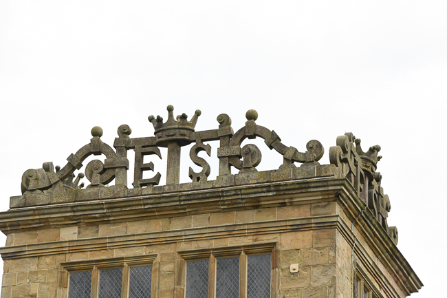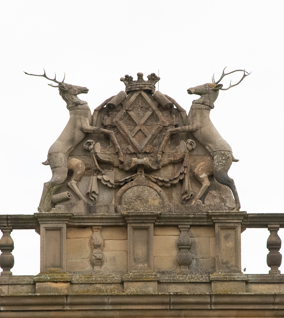 Arms of Elizabeth Hardwick displayed on the parapet above the main entrance of Hardwick Hall. The two stags are those of the Cavendish family. That was from her second husband, twice-widowed Sir William Cavendish.