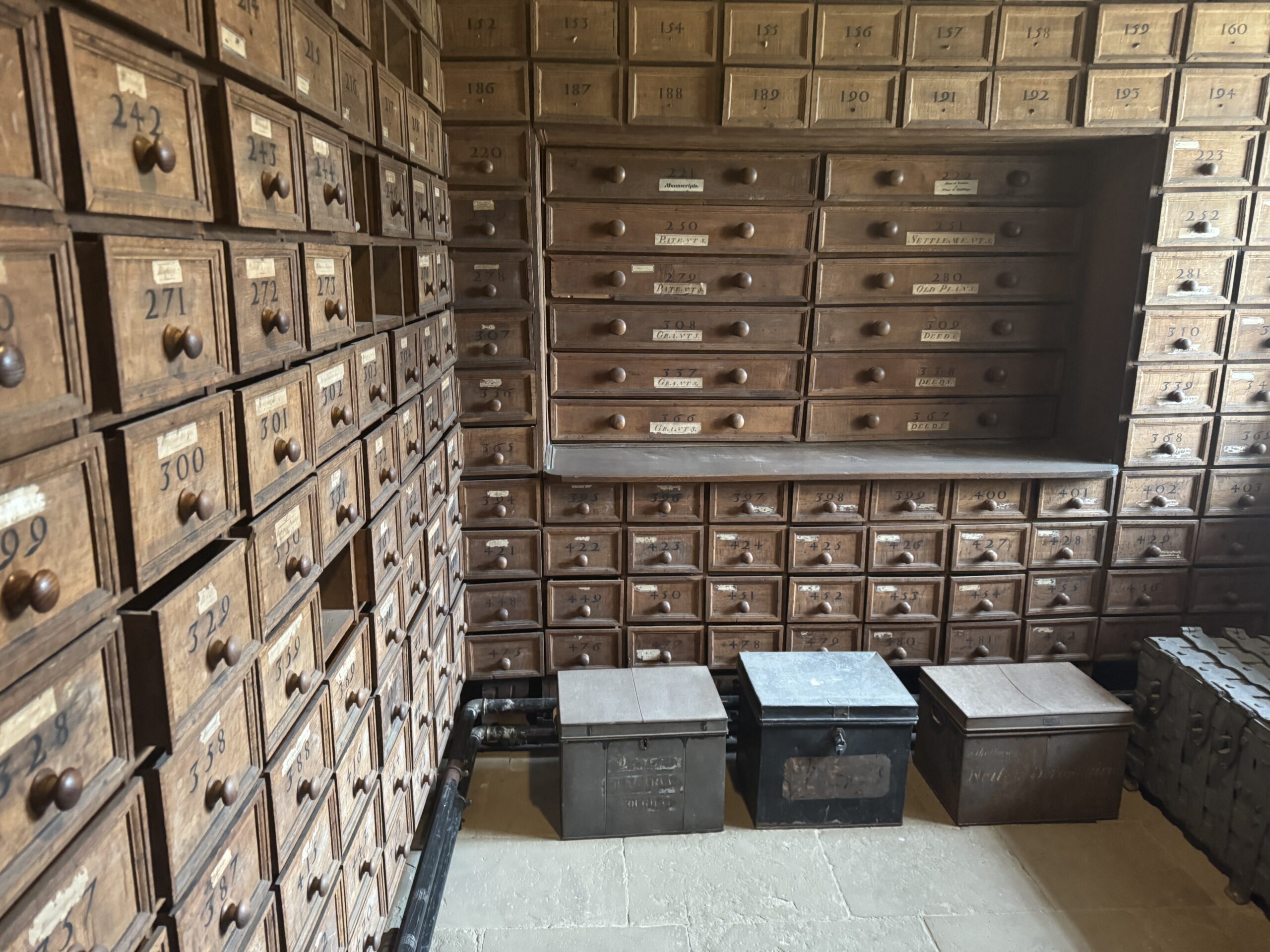 Important documents and deeds for the estate were kept in the Muniment room. The room features barrel-vaulted ceilings to provide additional fire protection and security.  It was Bess’s son William who added the muniment drawers.